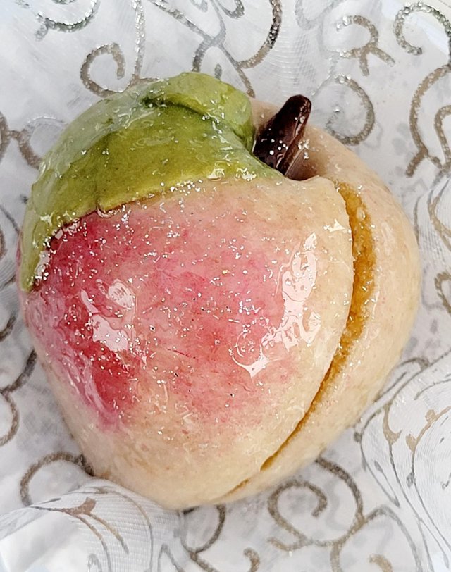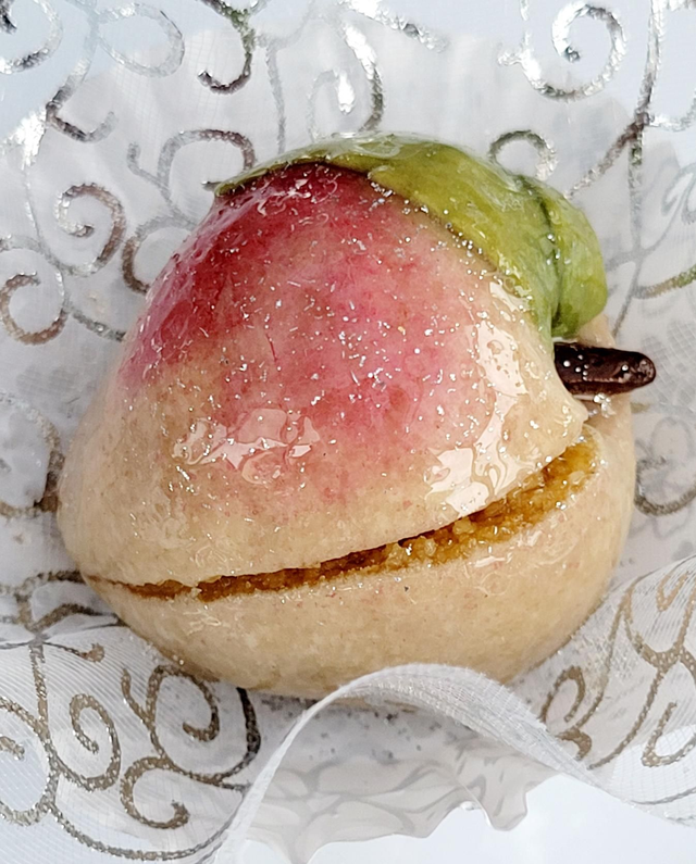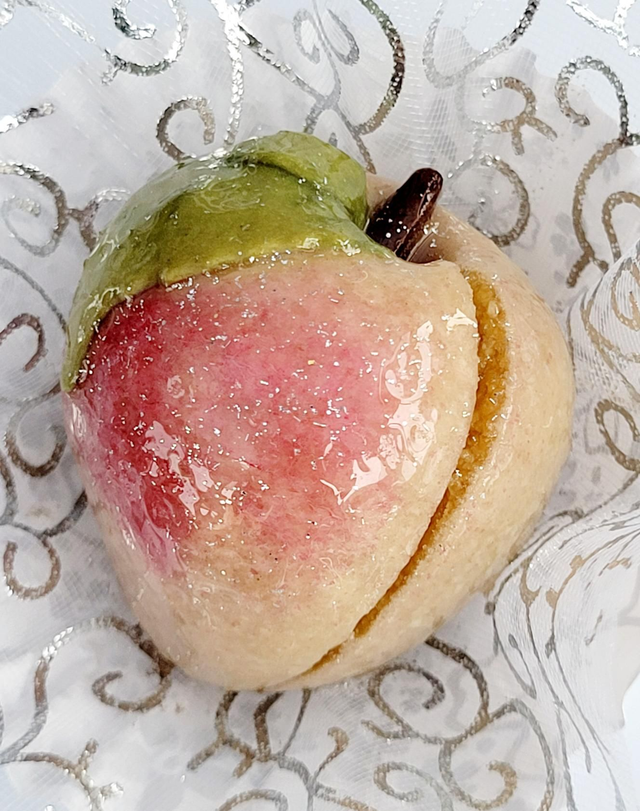 Pâte fine vanillée, fourrée à l'amande et à la pêche 🍑.